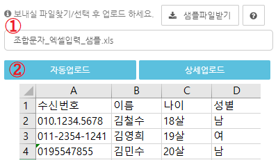 1번은 업로드 한 파일을 3번 샘플 파일에 맞춰 읽어 수신번호, 이름, 항목1, 항목2 순으로 입력되며,