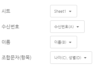 2번은 엑셀파일의 시트와 수신번호, 이름, 항목1, 항목2 등을 직접 선택하여 업로드 할 수 있도록 합니다.