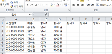 다운로드 한 샘플파일을 수신번호, 이름, 항목1, 항목2 순서대로 데이터를 입력합니다.