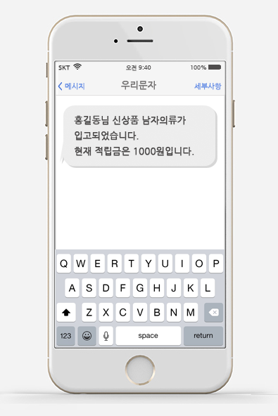 조합문자로 보낸 메시지를 수신한 화면 입니다.